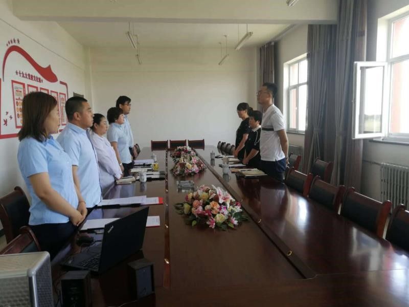 圖為世浩供排水有限責(zé)任公司召開(kāi)黨支部成立大會(huì)時(shí)全體人員起立奏唱國(guó)歌