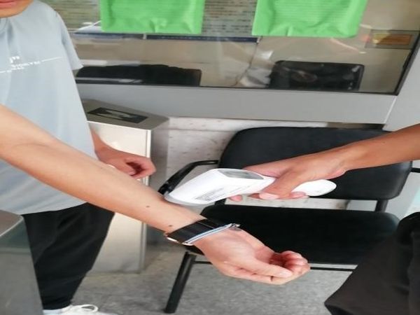 圖為對入?yún)^(qū)員工進(jìn)行體溫檢測并登記