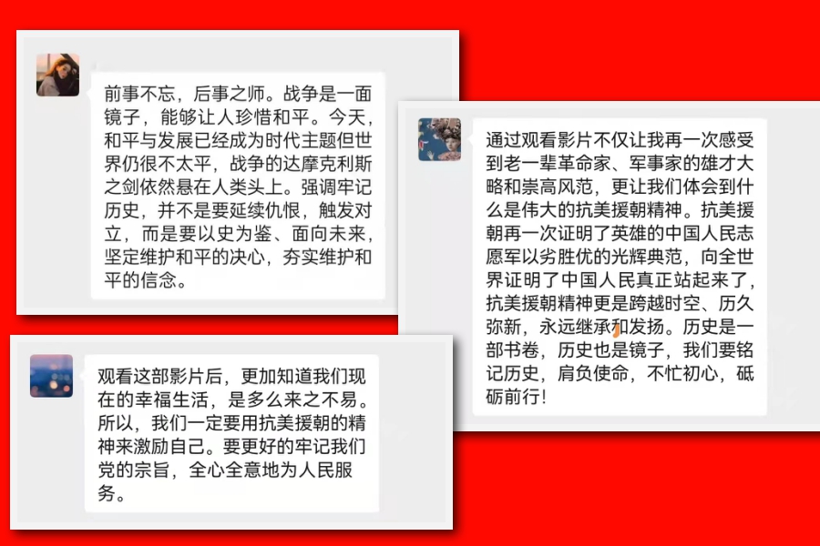 觀影過后,黨員干部們深深地被志愿軍戰(zhàn)士的鋼鐵意志所感動,大家深切地感受到革命先烈為我們的祖國作出的巨大犧牲,今天幸福生活的來之不易。大家紛紛表示,今后要將電影帶來的深刻感受轉化為實際行動,繼承和弘揚偉大的抗美援朝精神,時刻激勵自己,以更加飽滿的熱情、更加昂揚的斗志砥礪奮進,求真務實做好本職工作,以實際行動守初心、擔使命。