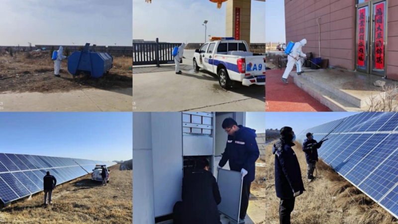 圖為光伏電站員工疫情期間進(jìn)行日常消殺及設(shè)備維修檢修工作