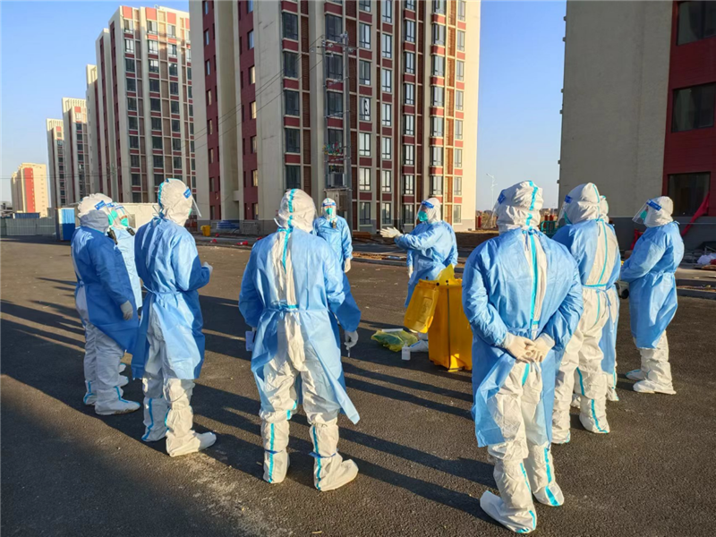圖為集團(tuán)工作人員在沙爾沁公租房隔離點(diǎn)安排疫情相關(guān)工作