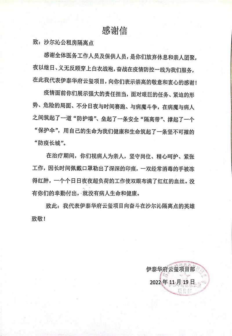 圖為伊泰華府云璽項(xiàng)目部向沙爾沁公租房隔離點(diǎn)致的一封感謝信