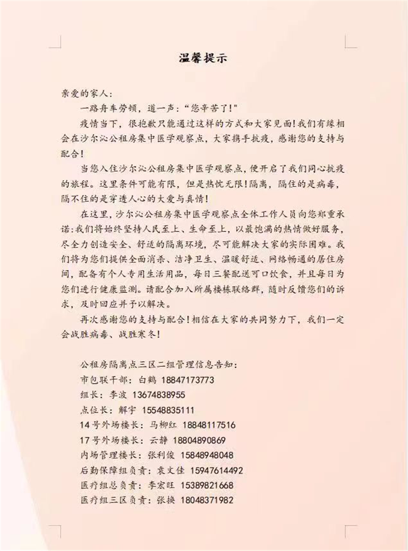 圖為隔離點(diǎn)三區(qū)公布點(diǎn)位長(zhǎng)、包聯(lián)干部及工作人員電話,及時(shí)回應(yīng)隔離人員的訴求并予以解決