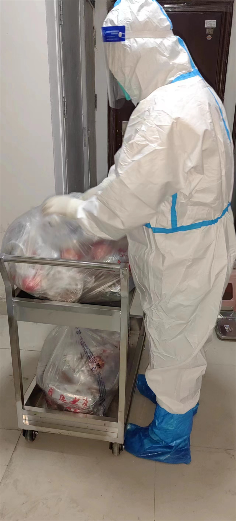 圖為集團(tuán)工作人員為隔離人員配送晚餐和水果