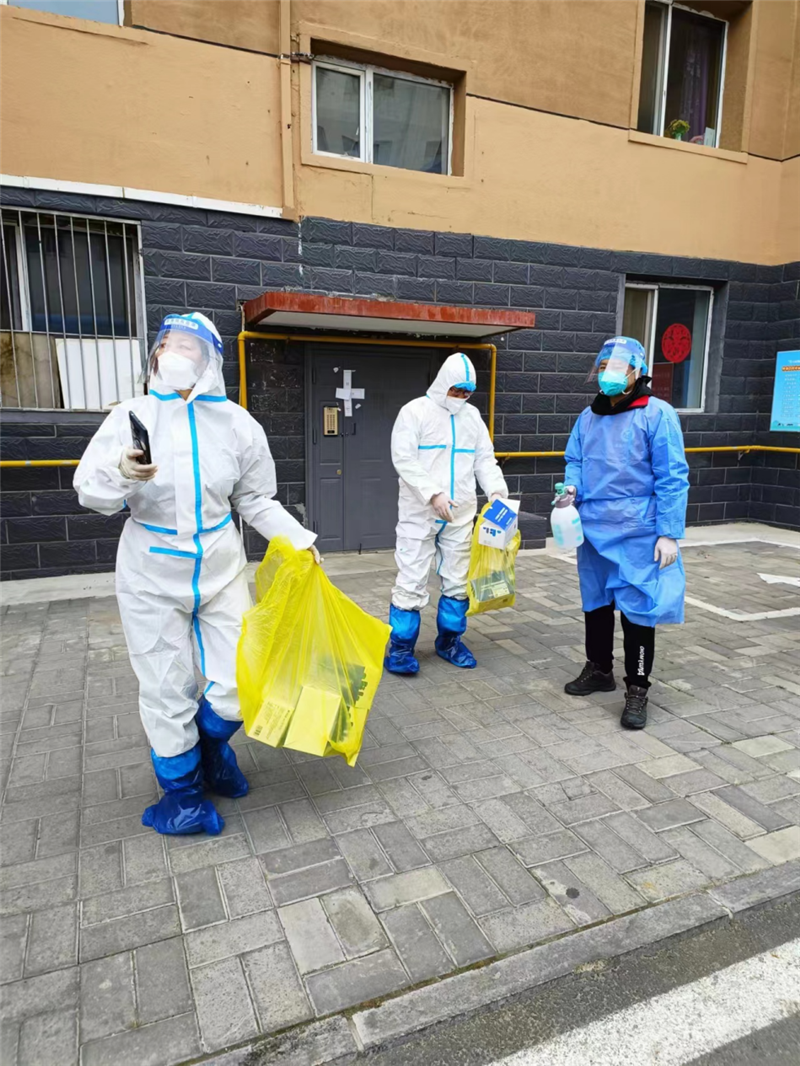 圖為集團(tuán)黨員暢源在團(tuán)結(jié)小區(qū)南區(qū)配合社區(qū)給居民發(fā)放抗原