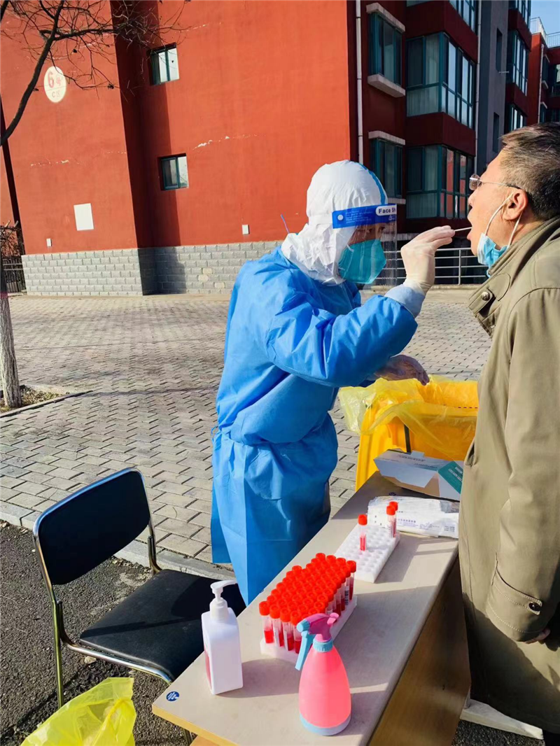 圖為集團(tuán)黨員馮旭明在賽罕區(qū)巴彥街道學(xué)苑社區(qū)師苑小區(qū)做核酸采集工作