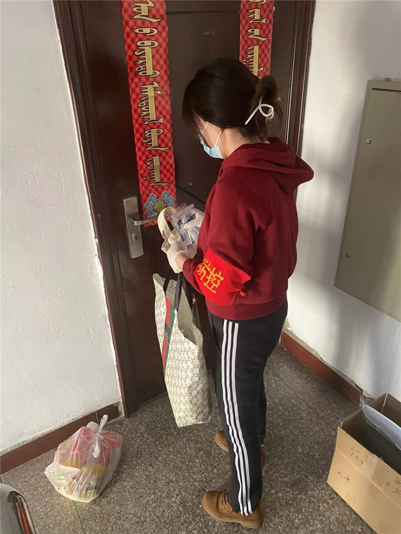 圖為集團(tuán)黨員云靜配合怡水園社區(qū)為水木年華水務(wù)小區(qū)發(fā)放抗原